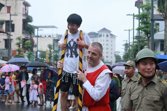 Chiều 30/4, trong khuôn khổ Lễ hội đường phố tại Festival Nghề truyền thống Huế 2023, Đoàn nghệ thuật cà kheo thành phố Namur - Bỉ đã có màn biểu diễn đi cà kheo đặc sắc của mang đến không khí rộn ràng, vui tươi, đầy sắc màu cho đường phố Huế.