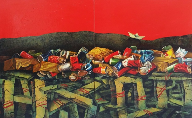 | Tác phẩm Bình minh đỏ (Acrylic) của họa sĩ Nguyễn Khắc Tài |
