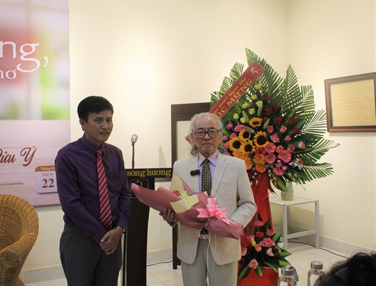 | Nhà thơ Lê Vĩnh Thái - Phó Chủ tịch Liên hiệp các Hội VHNT Thừa Thiên Huế - Tổng Biên tập Tạp chí Sông Hương tặng hoa chúc mừng dịch giả Bửu Ý |