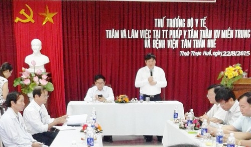 Ngày 22/8/2015 Đoàn công tác của Bộ Y tế do GS.TS Nguyễn Viết Tiến - Thứ trưởng Bộ Y tế đến thăm và làm việc tại Trung tâm Pháp Y tâm thần khu vực miền Trung và Bệnh viện Tâm thần Huế để đánh giá hoạt động của Trung tâm Pháp Y tâm thần khu vực miền Trung trong thời gian từ ngày thành lập 01/7/2015 đến nay.