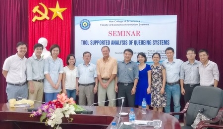 Khoa Hệ thống Thông tin Kinh tế, Trường Đại học Kinh tế Huế đã tổ chức seminar "Tool supported analysis of queueing systems" với sự tham gia trình bày của GS Janos Sztrick, Trưởng Bộ môn Hệ thống Thông tin Kinh tế và mạng -Khoa Tin học-Trường Đại học Debrecen, Hungary vào chiều ngày 24/08/2015.