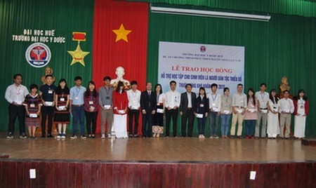 Trường Đại học Y dược Huế vừa tổ chức Lễ trao học bổng hỗ trợ học tập cho sinh viên là người dân tộc thiểu số vùng khó khăn vượt khó trong học tập năm học 2014-2015.