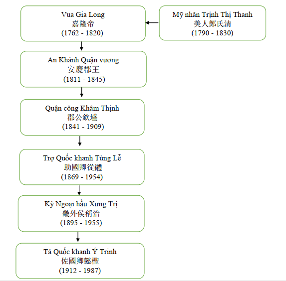 Tiếp đến là Xưng Trị 稱治 (1895 - 1955) là con trai trưởng của Tham tri Tùng Lễ, mẹ là bà Phạm Như Thị Khiêm. Ý Trinh 懿檉 (1912 - 1987) là con trai trưởng của Kỳ Ngoại hầu Xưng Trị, mẹ là bà Trương Thị Phương.