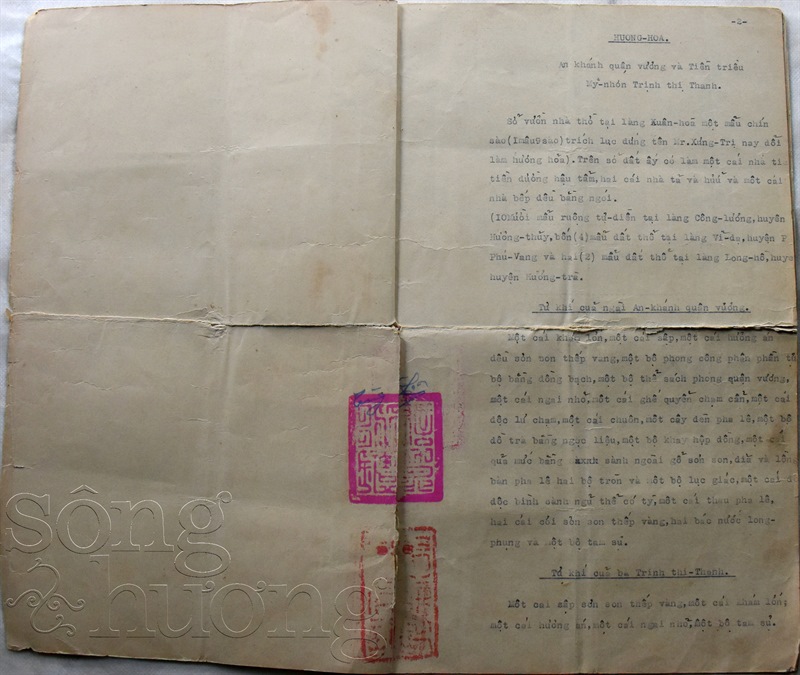 “Hương hỏa An Khánh Quận vương và Tiền triều Mỹ nhân Trịnh Thị Thanh: Sở vườn nhà thờ tại làng Xuân Hòa 1 mẫu 9 sào. Trên sở đất ấy có làm một cái nhà tiền đường hậu tẩm, hai cái nhà tả hữu và một cái nhà bếp bằng ngói. 10 mẫu ruộng tự điền tại làng Công Lương, huyện Hương Thủy, 4 mẫu đất thổ tại làng Vỹ Dạ, huyện Phú Vang và 2 mẫu đất thổ tại làng Long Hồ, huyện Hương Trà. Tự khí của ngài An Khánh Quận vương: 1 cái khám lớn, 1 cái sập, 1 cái hương án đều sơn son thếp vàng, 1 bộ phong công phân phần tự bộ bằng đồng bạch, 1 bộ thể sách phong Quận vương, 1 cái ngai nhỏ, 1 cái ghế quyển chạm cẩn, 1 cái độc lư chạm, 1 cái chuông, 1 cây đèn pha lê, 1 bộ đồ trà bằng ngọc liệu, 1 bộ khay hộp đồng, 1 cái quả mức bằng sành ngoài gỗ sơn son, dĩa và lồng bàn pha lê 1 bộ tròn và 1 bộ lục giác, 1 cái độc bình sành ngũ thể có tỳ, 1 cái thau pha lê, 2 cái cơi sơn son thếp vàng, 2 bát nước long phụng và 1 bộ tam sự. Tự khí của bà Trịnh Thị Thanh: 1 cái sập sơn son thếp vàng, 1 cái khám lớn, 1 cái hương án, 1 cái ngai nhỏ, 1 bộ tam sự”.