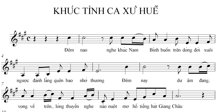 4.2. Trong Ca Huế thường xảy ra hiện tượng đảo phách, người trong nghề thường gọi là nhịp ngoại, nhịp nội (phân biệt với nhịp chánh). Đó là sự xáo trộn, sự trì hoãn khi tiếng ca, tiếng đàn “rơi” trệch khỏi phách hay nhịp mạnh, thể hiện tâm trạng chơi vơi, lãng đãng của một loại hình âm nhạc mang tính chất trữ tình cao như Ca Huế. Đặc điểm này tạo nên một “khoảng đất rộng” để nghệ sĩ thực hiện khả năng biến hóa lòng bản trong quá trình hòa tấu, vừa để diễn tả tâm trạng, tình cảm của mình, vừa khiến lời ca, chữ đàn nghe rõ ràng và “đắt” hơn. Có thể tìm thấy rất nhiều ví dụ như trong đoạn đầu của bài Tứ Đại cảnh hay trong bản Nam bình. Đặc điểm này đã được vận dụng trong một số ca khúc mới như Dòng sông ai đã đặt tên (Trần Hữu Pháp), Ngẫu hứng Lý Qua đèo (Việt Đức), Tơ vương (Vĩnh Phúc)… Yếu tố này xuất hiện trong ca khúc mới là một sự gợi nhớ đến loại tiết tấu thường dùng trong Ca Huế, góp phần tạo nên tính dân tộc, tính truyền thống trong tác phẩm.