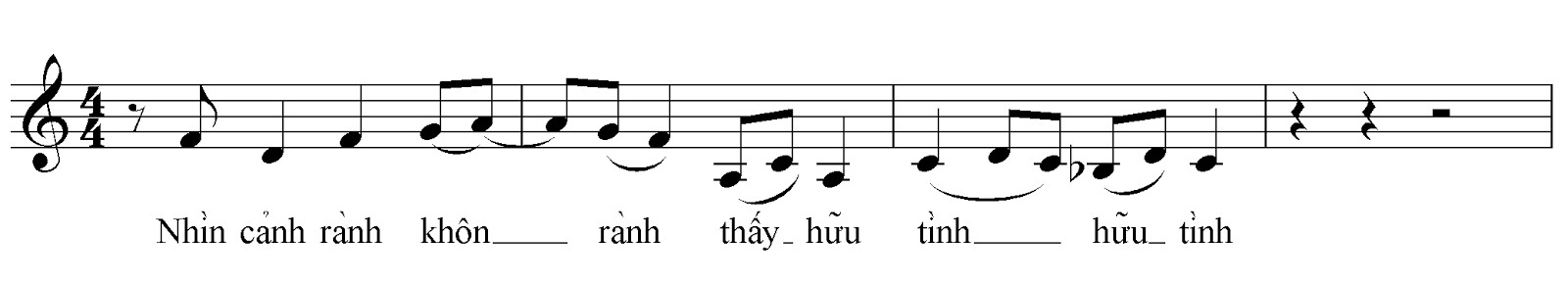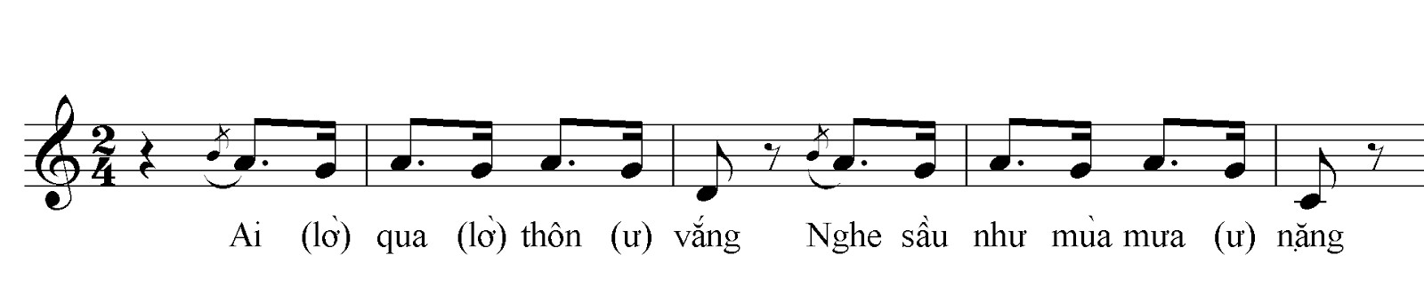 Ở đây, ta có thể thấy các từ có dấu sắc thường nằm ở âm khu trung hoặc trầm, và đều được luyến lên, các từ có dấu ngã cũng được hạ xuống ở âm khu trầm và có luyến lên.