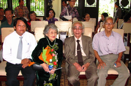Cụ Bà Huỳnh Thị Cam cùng nhạc sỹ Phan Huỳnh Điểu, Trần Hữu Pháp (phải) và nhà văn Hồ Đăng Thanh Ngọc trong Gala Tinh Hoa-Sông Hương |