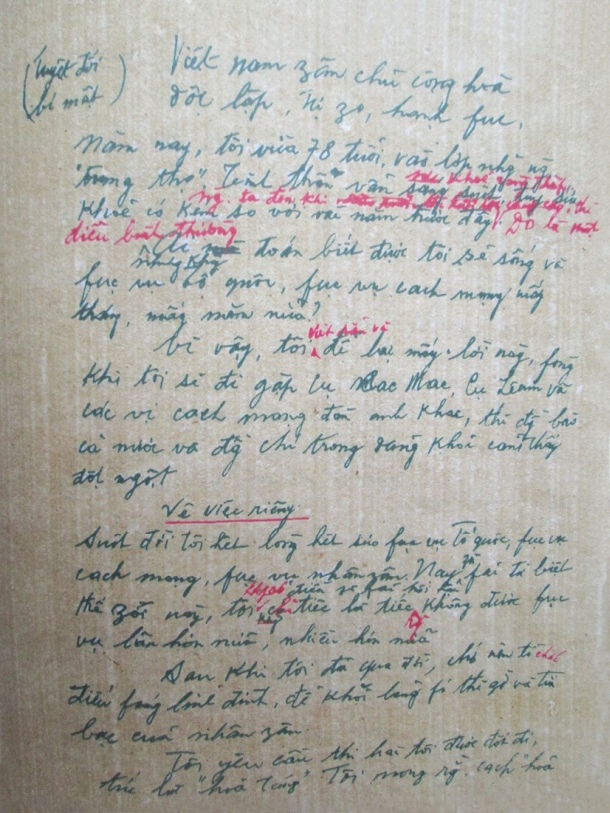 Ngày hôm sau, đúng ngày sinh nhật của Bác, Bác đọc lại kỹ hơn bản đã viết của mình, chỉ chữa thêm ba chữ ở phần đầu. Trong câu “Nhưng tinh thần, đầu óc vẫn sáng suốt như thường”, Bác khẳng định lại bằng câu: “Nhưng tinh thần, đầu óc vẫn rất sáng suốt”. Trong câu: “Khi người ta đã ngoài 70 tuổi”, Bác bỏ chữ “tuổi” và thay bằng chữ “xuân”. Bác dùng chữ “sẽ” thay cho chữ “phải” trong câu: “phòng khi tôi phải đi gặp cụ Các Mác, cụ Lênin và các vị cách mạng đàn anh khác”.