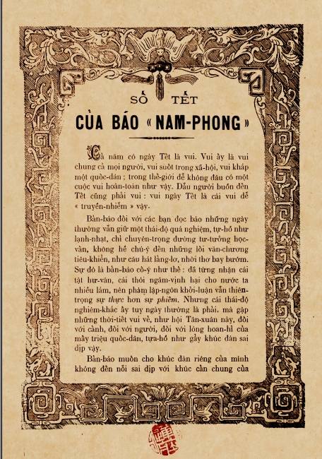 Theo vào những tư liệu hiện có, tạm thời có thể xác nhận Nam Phong (số xuân Mậu Ngọ - 1918) là tờ báo tết đầu tiên ở nước ta. Như thế, nét văn hóa này đã có lịch sử hơn 100 năm. Nhìn lại những số báo xuân xưa, lòng ta không khỏi bồi hồi, xốn xang vì cảm nhận được bước đi của thời gian, sự ngưng đọng của ý niệm con người trước vận hành miên viễn của vũ trụ. Số báo Nam Phong đánh dấu sự khởi đầu của một mĩ tục, đến giờ vẫn tỏa ra dư vị trong trời xuân thuở trước. Lời thưa trong số báo này định hình một sắc thái, dẫu đã qua cả trăm năm vẫn còn nguyên niềm hân hoan: “Cả năm có một ngày tết là vui. Vui ấy là vui chung cả mọi người, vui suốt trong xã hội […] Buổi đầu xuân năm mới, giời ấm khí hòa, cảnh vật tươi cười, lòng người hớn hở” (Lời thưa). Bởi thế, dù là tờ báo nghiêng về hàn lâm, học thuật, Nam Phong cũng phải chỉnh trang để trở nên “một cái quà phù hợp với cảnh năm mới”. Gác lại mọi bận bã ngày thường, Nam Phong nhắc con người về một mùa xuân mới, “nếm miếng bánh đường, nhắp chén rượu ngọt cho khoan khoái tinh thần […] Thắp hương, rải hoa, hun bút, mở giấy mà mừng tuổi cho nước nhà” (Lời thưa). Có lẽ, tinh thần ấy đã trở thành điển lệ cho tục làm báo tết hơn 100 năm qua.