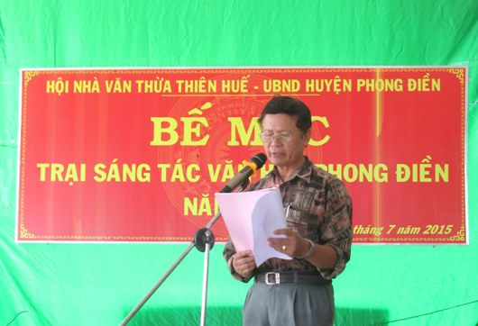 | Nhà thơ Nguyễn Thiền Nghi, Trại trưởng trại sáng tác Phong Điền năm 2015, đọc báo cáo sơ kết trại viết |