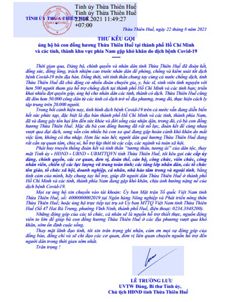 Phát huy truyền thống đoàn kết và tinh thần “tương thân, tương ái” của dân tộc, thay mặt Tỉnh ủy - HĐND - UBND - UBMTTQVN tỉnh Thừa Thiên Huế, tôi kêu gọi các cấp ủy đảng, chính quyền, các cơ quan, đơn vị, đoàn thể, cán bộ, công chức, viên chức, công nhân viên, chiến sỹ các lực lượng vũ trang toàn tỉnh; các tầng lớp nhân dân, các tổ chức tôn giáo, tổ chức xã hội, doanh nghiệp, cá nhân, nhà hảo tâm trong và ngoài tỉnh, bằng tình cảm của mình, hãy chung tay hỗ trợ, giúp đỡ người dân Thừa Thiên Huế ở thành phố Hồ Chí Minh và các tỉnh, thành phía Nam đang gặp khó khăn, chịu ảnh hưởng nặng nề của dịch bệnh Covid-19.