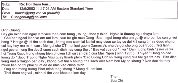 Bửu Chỉ gởi cho tôi xem bức chân dung tự họa Tiếng vọng một đời người vẽ tháng 10/2002, một trong vài bức tranh cuối của Chỉ. Dạo đó chúng tôi trao đổi qua email gần như hàng ngày, tôi thường in ra giữ lại những đoạn thư bàn về Phật về văn chương nghệ thuật. Email cuối cùng Bửu Chỉ gởi ghi ngày 9 tháng 12 năm 2002, mấy ngày kế tiếp không thấy email của bạn, cứ ngóng trông… để rồi tin dữ bất ngờ ập đến, Chỉ bị đột quỵ và ra đi sau 5 hôm vắng email, 14 tháng 12 năm 2002. Mới đó mà đã mười năm sao Chỉ: