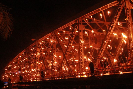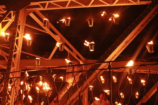 Tối 18/4, cầu Tràng trở nên lung linh, huyền ảo bởi hàng ngàn ngọn nến được thắp sáng do chính tay Đoàn nghệ thuật sắp đặt lửa nổi tiếng thế giới Carabosse đến từ Cộng hòa Pháp thực hiện.