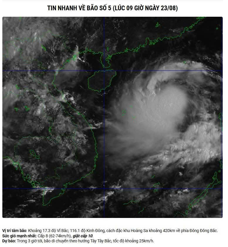 Theo dự báo của Trung tâm dự báo khí tượng thủy văn quốc gia, sáng nay (23/8/2025), áp thấp nhiệt đới trên vùng biển phía Đông khu vực Bắc Biển Đông đã mạnh lên thành bão - cơn bão số 5 (tên quốc tế là Kajiki); sau khi vào biển Đông, bão số 5 di chuyển nhanh với tốc độ khoảng 20 km/giờ, ngày 24/8 khi di chuyển tới khu vực quần đảo Hoàng Sa, cường độ có thể đạt cấp 10-11, giật cấp 13-14 và còn có thể mạnh thêm; ngày 25/8, bão sẽ di chuyển vào đất liền khu vực Trung Bộ nước ta. Do ảnh hưởng hoàn lưu bão số 5, từ ngày 24-27/8/2025 trên đất liền thành phố Huế có mưa vừa, mưa to, có nơi mưa rất to và dông; trong cơn dông cần đề phòng lốc, sét, mưa đá và gió giật mạnh; nguy cơ xảy ra lũ ống, lũ quét, sạt lở đất và ngập lụt tại vùng thấp trũng, ven sông, khu đô thị. Vùng biển Khu vực Bắc Biển Đông (bao gồm đặc khu Hoàng Sa), có gió mạnh cấp 6-7, sau tăng lên cấp 8, vùng gần tâm bão đi qua cấp 9-10, giật cấp 12, sóng biển cao 3,0-5,0m, vùng gần tâm bão 4,0-6,0m, biển động rất mạnh. Đây là cơn bão cường độ mạnh, khả năng cao sẽ đổ bộ trực tiếp vào đất liền, gây gió mạnh, mưa lớn khu vực Trung Bộ nước ta ngay trong những ngày diễn ra các hoạt động chuẩn bị cho Đại lễ Quốc khánh 02/9, diễn biến của bão, mưa lũ còn rất phức tạp.