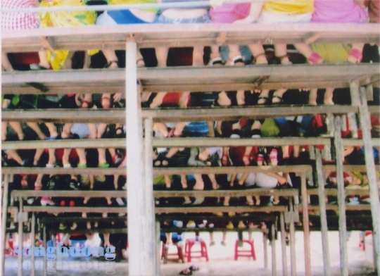 | Các bé ngồi trên các bục chắc chắn thoải mái xem rối nước |