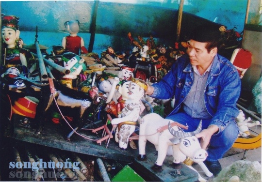 | Đạo diễn Nguyễn Phi Tuấn chuẩn bị con rối nước phục vụ các bé |