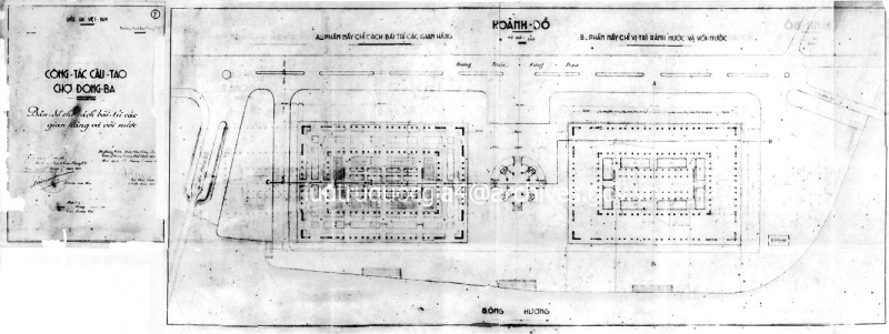 Trong quá trình khảo sát, tra tìm tài liệu có liên quan đến vùng đất Cố đô, chúng tôi đã tìm thấy Hồ sơ ký hiệu số 1958, trong đó có bản họa đồ thiết kế chợ Đông Ba. Trong bộ hồ sơ này có hai bản vẽ công tác cấu tạo chợ Đông Ba với kích thước 115cm x 42cm, do Phòng Kiến trúc Nha Công chánh Giao thông Trung Việt thiết định ngày 14/6/1951 và được Giám đốc Nha Công chánh Giao thông Trung Việt duyệt ngày 18/6/1951. Bản vẽ thứ nhất là Bản đồ vị trí chợ mới và vị trí chợ cũ, bản vẽ thứ hai là Bản đồ chỉ cách bài trí các gian hàng và vòi nước. Đây là nguồn tài liệu gốc, xin trân trọng giới thiệu đến các nhà nghiên cứu cùng bạn đọc.