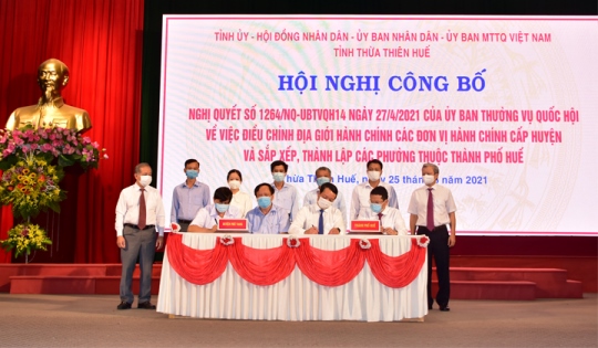 Sáng ngày 25/6, tỉnh Thừa Thiên Huế tổ chức Hội nghị Công bố, bàn giao và triển khai thực hiện Nghị quyết số 1264/NQ-UBTVQH14 ngày 27/4/2021 của Ủy ban Thường vụ Quốc hội về việc điều chỉnh địa giới các đơn vị hành chính cấp huyện và sắp xếp, thành lập các phường thuộc thành phố Huế.