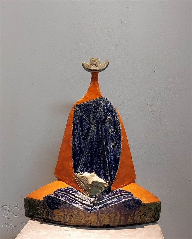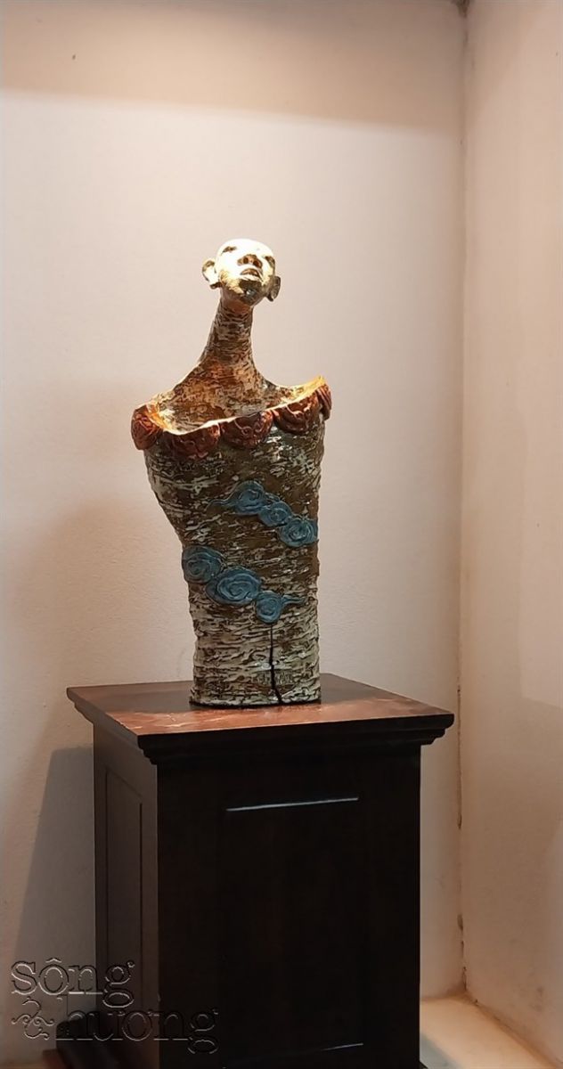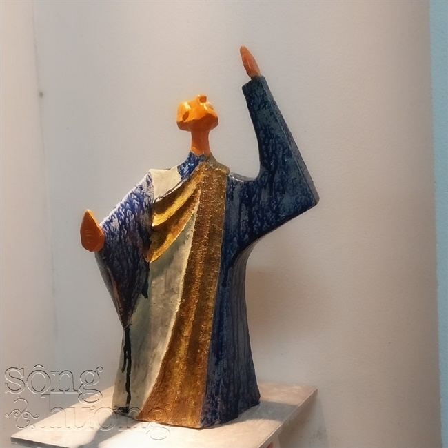 Tác phẩm “Ngân nga bùng cháy” là bức tượng theo mô típ thô mộc, thân và đế liền khối, gương mặt được biểu hiện trông rất ngờ nghệch hồn nhiên xích tử chi tâm của các vị thánh đã thấu đạt đạo lý. Với ánh nhìn thấu thị của trí vô phân biệt.
