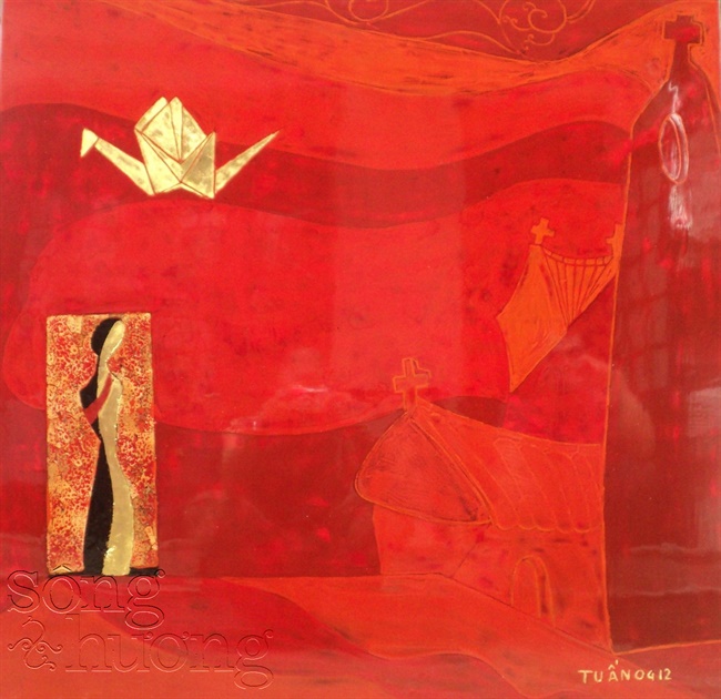 Đỏ, vàng là gam màu chủ đạo trong các tác phẩm sơn mài của Hà Minh Tuấn. Phổ màu son đỏ kết hợp với hình tượng Đức Phật, các biểu tượng Phật giáo hay hoa sen trắng khiến người viết liên tưởng đến vị tổ sư Liên Hoa Sinh, thuộc hệ phái Mật giáo Kim Cương thừa.