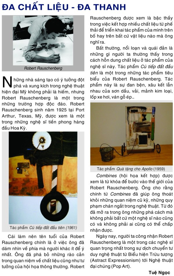 Robert Rauschenberg sinh năm 1925 tại Port Arthur, Texas, Mỹ, được xem là một trong những nghệ sĩ tiền phong hàng đầu Hoa Kỳ.
