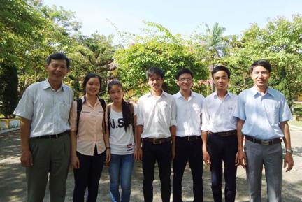 Thầy hiệu trưởng Nguyễn Hối (ngoài cùng bên trái) cùng với các thủ khoa, á khoa là học sinh của trường
