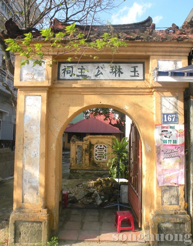 Từ đường đức bà Ngọc Lâm công chúa (tại số 167 Phan Đình Phùng) còn giữ gìn khá nguyên vẹn. Nhà thờ quay mặt nhìn về hướng Nam, phía trước có sông An Cựu chảy ngang làm yếu tố minh đường. Từ ngoài vào trong, nhà thờ gồm có các công trình được xây dựng theo thứ tự sau: cổng, bình phong, nhà thờ chính và sân nhà. Ra vào nhà thờ Ngọc Lâm công chúa có một cổng ngõ hình vòm xây bằng gạch, vôi vữa, tường quét vôi màu vàng, nóc mái trang trí họa tiết hoa lá “hóa” và các hoa văn cách điệu. Chính giữa cổng, ở mặt ngoài, bên dưới mái là kiểu bố cục ô hộc theo chiều dọc tạo nên biển ngạch đề năm chữ Hán: “Ngọc Lâm công chúa từ - 玉林公主祠” (Nhà thờ Ngọc Lâm công chúa). Tả hữu cổng có hai cột trụ thẳng đỡ mái, mũ trụ và chân cột có trang trí hoa văn. Nằm giữa hai trụ có trang trí câu đối bằng chữ Hán nhưng đã mờ nét theo thời gian. Sau cổng vòm là bức bình phong theo kiểu cuốn thư, quét vôi màu vàng và tại vị trí chính giữa có trổ chữ Thọ theo lối chữ triện. Bình phong dùng để che chắn cho nhà thờ khỏi mọi tai ách đến từ bên ngoài.