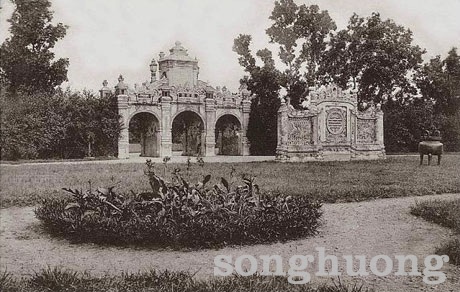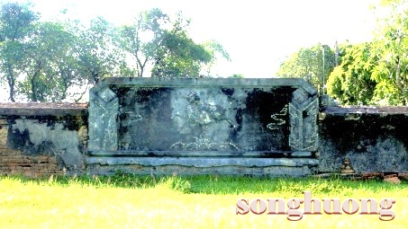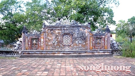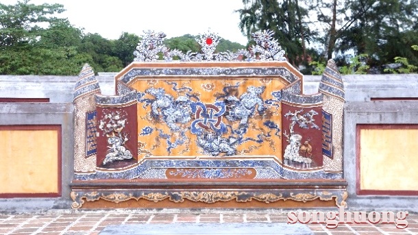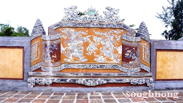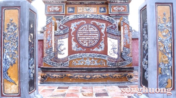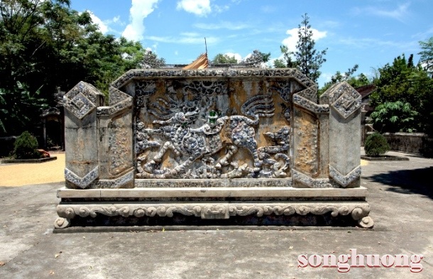 | Bình phong “Tam Lân hí cầu” và “Song Phụng” ở sau mộ vua Dục Đức và Hoàng hậu Từ Minh |