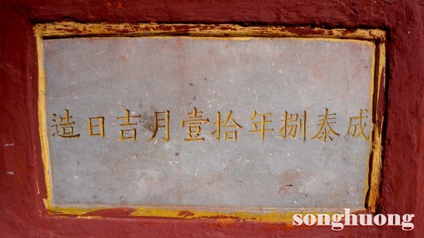 | Bình phong Long Mã ở bên hàng rào trái của Trường Quốc Học; Dòng chữ Hán trên Bình phong “Thành Thái bát niên thập nhất nguyệt cát nhật tạo” (Làm vào ngày tốt, tháng 11, năm Thành Thái thứ 8) - Năm 1896 |