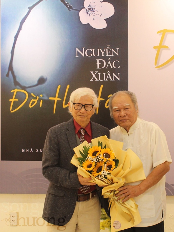 | Nhà thơ Nguyễn Đắc Xuân và nhà thơ Mai Văn Hoan trong buổi ra mắt sách tại Tạp chí Sông Hương chiều ngày 12/2/2023 |