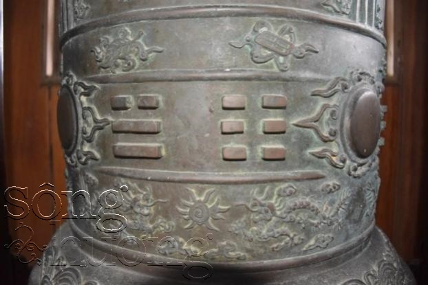 Bốn núm đánh được nối liền nhau bằng gờ nổi, bên trái và phải của núm có trang trí sáu dải mây hình mũi mác, mỗi bên ba dải. Một trong những nét đặc trưng nổi bật mà ít chuông có được là hình đúc nổi biểu tượng bát bửu, tám quẻ bát quái, lưỡng long triều nhật cách đều chạy quanh thân chuông. Trong đó ở giữa tám vật quý này đều có một dải là quấn ngang ở giữa và hai đầu uốn lượn. Đây là một cách thức trang trí ước lệ rất cổ điển được duy trì ở các triều đại trước trên các chất liệu khác nhau như gỗ, sành sứ, lụa. Miệng chuông loe, uốn cong, có gờ gấp ở sát viền miệng và trang trí họa tiết tam sơn, thủy ba uốn lượn đều đặn theo nhịp.