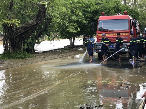 Chiều 16/10, nước lũ trên nhiều tuyến đường ở TP Huế đang rút dần, sông Hương trên báo động 2, Công an tỉnh Thừa Thiên-Huế đã huy động lực lượng Cảnh sát PCCC và cứu nạn, cứu hộ (CNCH) cùng các đơn vị chức năng khác tham gia dọn bùn non làm sạch các tuyến đường trung tâm TP Huế.