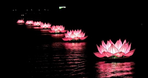 Tối 08/5, tại Nghinh Lương đình, Ban Trị sự - Ban Tổ chức Đại lễ Phật đản Pl.2566 tổ chức lễ Thắp sáng 7 hoa sen trên sông Hương cầu quốc thái dân an.