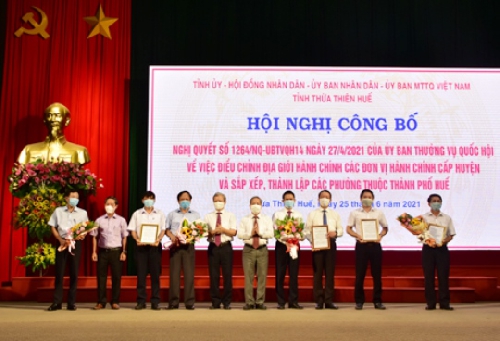 Sáng ngày 25/6, tỉnh Thừa Thiên Huế tổ chức Hội nghị Công bố, bàn giao và triển khai thực hiện Nghị quyết số 1264/NQ-UBTVQH14 ngày 27/4/2021 của Ủy ban Thường vụ Quốc hội về việc điều chỉnh địa giới các đơn vị hành chính cấp huyện và sắp xếp, thành lập các phường thuộc thành phố Huế.