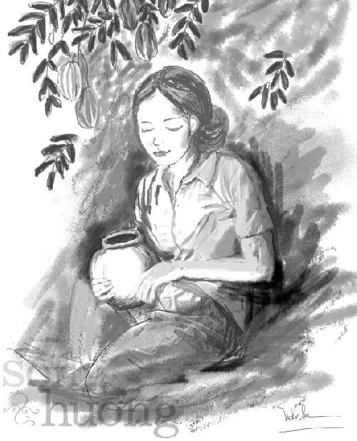 Đôi chim sẻ ríu ran ríu rít. Âm thanh véo von của nó đánh thức cả khu vườn còn mê ngủ. Luống xà lách non tơ cụm đầu vào nhau như bàn tay nõn nà của cô thiếu nữ. Kia là dãy ngò rí thơm lừng liu ríu các ngọn tơ. Thơm nức vẫn là cây húng quế. Mùi thơm nhẹ mà bám lâu trong tay người hái. Buồn buồn mà ngửi lá húng quế thấy lòng nhẹ nhõm lạ.