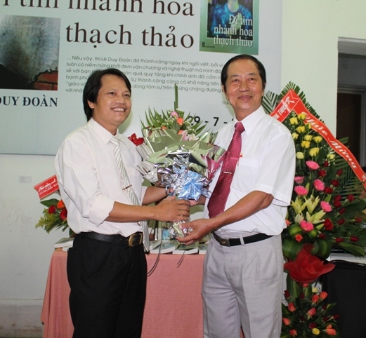 | Nhà văn Hồ Đăng Thanh Ngọc - Tổng biên tập Tạp chí Sông Hương tặng hoa chúc mừng tác giả Lê Duy Đoàn |