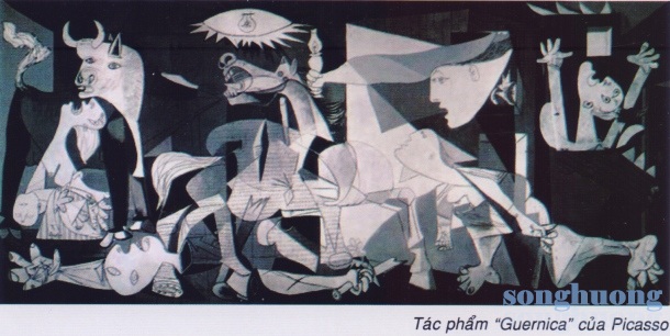 Trong tác phẩm kinh điển “Guernica” của Picasso, có rất nhiều tiếng gào thét thể hiện cho những nỗi đau, sự căm phẫn và hoảng loạn. Đó là những tiếng thét con người và loài thú, cụ thể là một con bò đực và một con ngựa. Qua hình tượng con bò đực và con ngựa - những biểu tượng văn hóa của Tây Ban Nha, người ta cảm nhận được sự xé nát của chiến tranh. Một sự hỗn loạn trong chiến trận đã được tác giả mô tả thành công nhờ sự hòa trộn giữa hình tượng con người và loài vật.