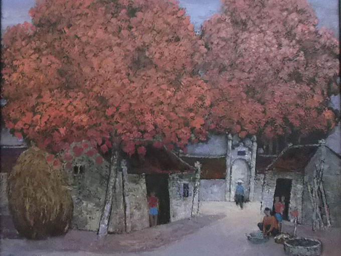 Làng quê Việt qua bút pháp của Dương Sen hiện lên tĩnh lặng, bình yên, đầm ấm. Vốn là họa sĩ có thâm niên đắm đuối với sơn mài (ông đã có 10 triển lãm cá nhân tranh sơn mài), ông xem sơn dầu như một lối rẽ thú vị. Dấu ấn của sơn mài có thể thấy rõ qua gam màu đỏ, ấm nóng được sử dụng nhiều trong các tác phẩm bày ở triển lãm lần này.