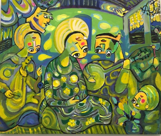 | Tác phẩm Ca Huế trên Sông Hương, chất liệu Acrylic, kích thước 83cm x 99cm; |