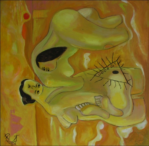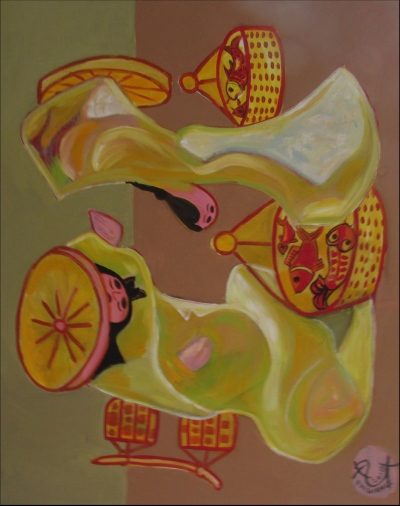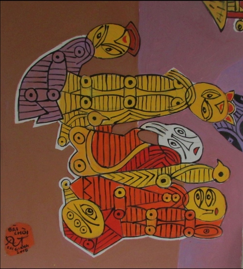| Tắm biển, Acrylic và sơn dầu trên bố, 36x36inc | Bài chòi, Acrylic và sơn dầu trên bố, 36x39inc |