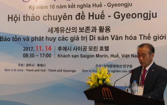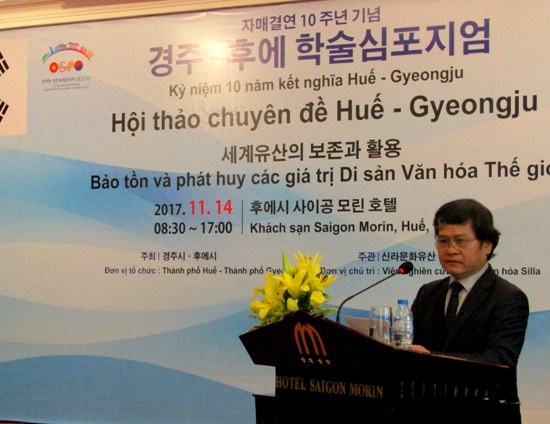 Sáng ngày 14/11, UBND Thành phố Huế và thành phố Geyongju – Hàn Quốc đã phối hợp tổ chức Hội thảo chuyên đề “ Bảo tồn và phát huy các giá trị Di sản Văn hóa Thế giới”. Hội thảo diễn ra nhân kỷ niệm 25 năm quan hệ Việt Nam – Hàn Quốc kết hợp kỷ niệm 10 năm hợp tác kết nghĩa giữa thành phố Huế và thành phố Gyeongju.
