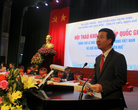 Đồng chí Võ văn Thưởng nhấn mạnh: Hội thảo khoa học hôm nay là một trong những hoạt động lớn, trọng tâm, có ý nghĩa thiết thực trong chuỗi các sự kiện Kỷ niệm 100 năm Ngày sinh của đồng chí Lê Đức Anh (01/12/1920 - 01/12/2020). Để Hội thảo đạt được mục đích, ý nghĩa đã xác định, Hội thảo cần tập trung thảo luận, khẳng định cuộc đời, sự nghiệp cách mạng gian khổ nhưng vẻ vang của đồng chí Lê Đức Anh gắn liền với sự nghiệp đấu tranh cách mạng giải phóng dân tộc, thống nhất đất nước và công cuộc đổi mới, xây dựng và bảo vệ vững chắc Tổ quốc Việt Nam xã hội chủ nghĩa xã hội; làm rõ công lao, cống hiến to lớn của đồng chí Lê Đức Anh đối với sự nghiệp cách mạng của Đảng và dân tộc, đặc biệt là đối với thắng lợi vĩ đại trong hai cuộc kháng chiến chống thực dân Pháp và đế quốc Mỹ xâm lược; thắng lợi trong cuộc chiến tranh bảo vệ biên giới Tây Nam của Tổ quốc cùng quân dân Campuchia chiến thắng chế độ diệt chủng Pôn Pốt và trong sự nghiệp đổi mới đất nước, xây dựng và bảo vệ Tổ quốc; phân tích và làm sâu sắc hơn những quan điểm, tư tưởng của đồng chí Lê Đức Anh về những vấn đề lý luận và thực tiễn trong xây dựng và bảo vệ đất nước; đấu tranh cách mạng, cũng như sự nghiệp đấu tranh chống ngoại xâm giành lại độc lập, tự do dân tộc, hòa bình, thống nhất đất nước; xây dựng nền quốc phòng toàn dân, phát triển khoa học, nghệ thuật quân sự Việt Nam; xây dựng lực lượng vũ trang nhân dân, nhất là Quân đội Nhân dân vững mạnh toàn diện; củng cố quốc phòng; mở rộng quan hệ đối ngoại của đất nước; khẳng định những giá trị tinh thần và bài học kinh nghiệm từ cuộc đời hoạt động cách mạng sôi nổi, phong phú và cuộc sống bình dị của đồng chí Lê Đức Anh, góp phần giáo dục, bồi dưỡng tinh thần yêu nước, hun đúc niềm tự hào dân tộc, truyền thống cách mạng của quê hương Thừa Thiên - Huế cho các thế hệ người Việt Nam, vận dụng vào sự nghiệp xây dựng và bảo vệ Tổ quốc hiện nay;