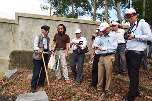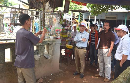 Nhà nghiên cứu Nguyễn Đắc Xuân thuyết minh tại thực địa bên mộ mẹ của cụ Phạm Liệu, nơi nghi vấn có các di vật của cung điện Đan Dương |