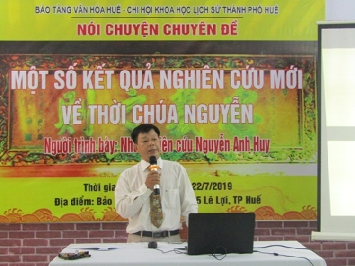 Chiều ngày 22/7, Bảo tàng văn hóa Huế phối hợp với Chi hội Khoa học Lịch sử thành phố Huế tổ chức Buổi nói chuyện chuyên đề " Một số kết quả nghiên cứu mới về thời Chúa Nguyễn" của nhà nghiên cứu, bác sĩ Nguyễn Anh Huy.