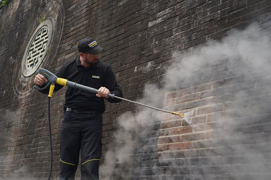 Thử nghiệm sử dụng máy phun hơi nước làm sạch Ngọ Môn ( Ảnh: Di sản Huế) |