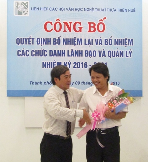 Chiều ngày 9/9, Ban chấp hành Liên hiệp các Hội VHNT Thừa Thiên Huế đã tổ chức lễ công bố quyết định bổ nhiệm lại và bổ nhiệm các chức danh lãnh đạo và quản lý của cơ quan Liên hiệp các Hội VHNT Thừa Thiên Huế nhiệm kỳ 2016-2021.