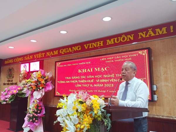 Chiều 16/5, Công an tỉnh Thừa Thiên-Huế phối hợp với Liên hiệp các Hội văn học nghệ thuật tỉnh tổ chức Khai mạc trại sáng tác văn học nghệ thuật “Công an Thừa Thiên-Huế - Vì bình yên cuộc sống” lần thứ II năm 2023. Tham dự buổi lễ có đồng chí Phan Ngọc Thọ, Phó Bí thư Thường trực Tỉnh ủy Thừa Thiên-Huế; đại diện lãnh đạo Ban Tuyên giáo Tỉnh ủy; Sở TT&TT, Sở VH&TT; Liên hiệp các Hội VHNT tỉnh; đại diện các Phòng, ban Công an tỉnh và đông đảo văn nghệ sĩ.