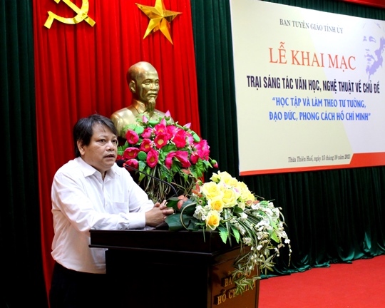 Sáng 15/10, tại hội trường Bảo tàng Hồ Chí Minh Thừa Thiên Huế, Ban Tuyên giáo Tỉnh ủy, Liên hiệp các Hội VHNT tỉnh đã tổ chức Lễ Khai mạc trại sáng tác VHNT chủ đề “Học tập và làm theo tư tưởng, đạo đức, phong cách Chủ tịch Hồ Chí Minh”. Tham dự có ông Hoàng Khánh Hùng - UVTV, trưởng Ban Tuyên giáo Tỉnh ủy.