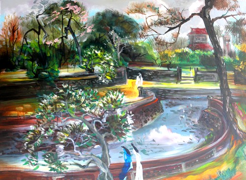 Bằng các chất liệu khác nhau như sơn dầu, màu nước, acrylic, bút sắc… 28 tác phẩm đã phác họa nên một vùng non nước hữu tình và những dấu vết thời gian trên mỗi viên ngói cũ, mỗi dãy tường gạch dài lấp loáng rêu phong… ở một trong những khu lăng tẩm đẹp nhất nằm trong quần thể di tích Cố đô Huế, là di sản của thế giới: Khiêm lăng.