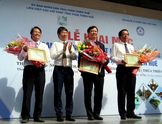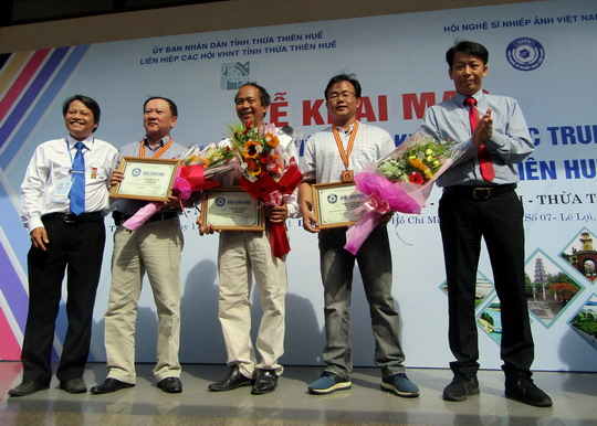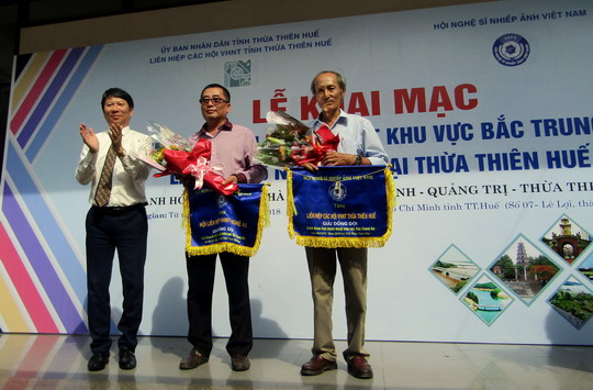| Ông Phan Tiến Dũng - Giám đốc Sở Văn hóa, Thể thao tỉnh Thừa Thiên Huế và NSNAPhạm Văn Tý - Phó Chủ tịch Hội Nghệ sỹ Nhiếp ảnh Việt Nam trao Huy chương Bạc cho tác giả Trương Vững và tác giả Lê Huy Hoàng Hải |